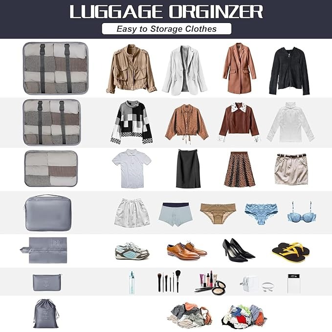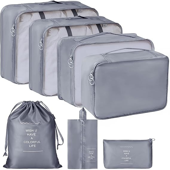 - Complete Set: 7 piece travel packing set includes laundry bag, toiletry bag, shoe bag, and 4 small bags for various toiletries and accessories.